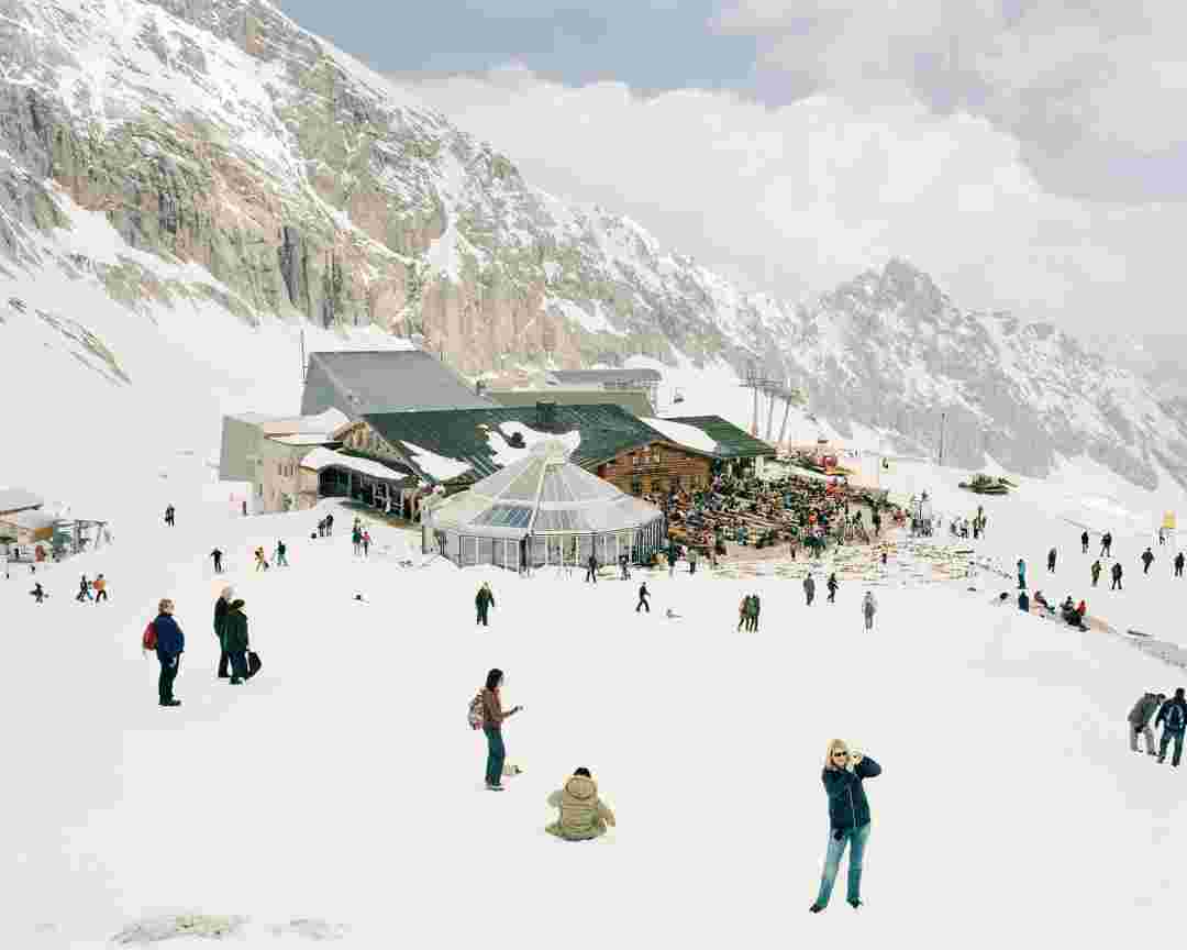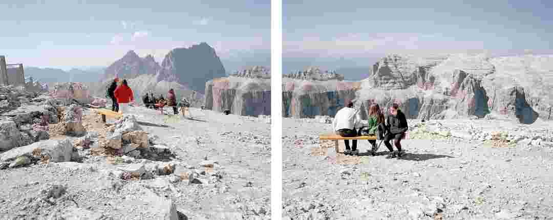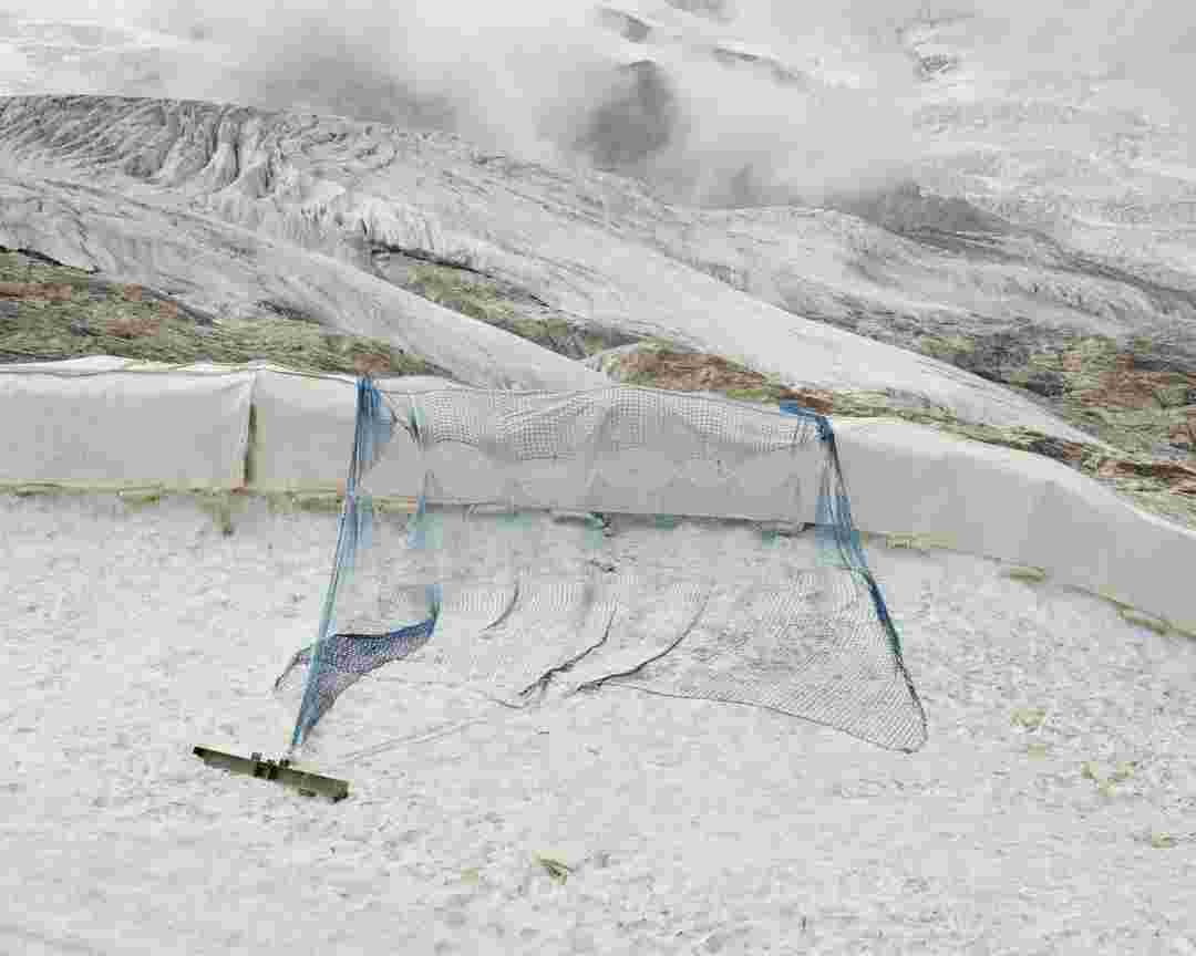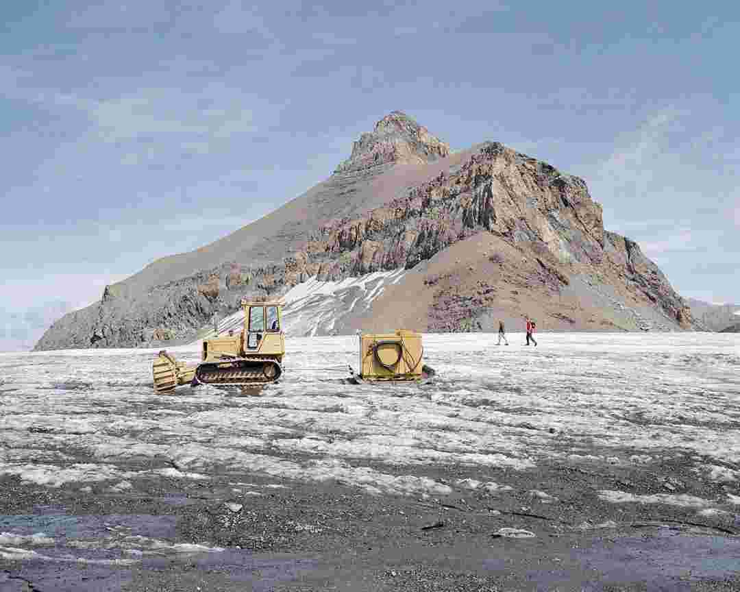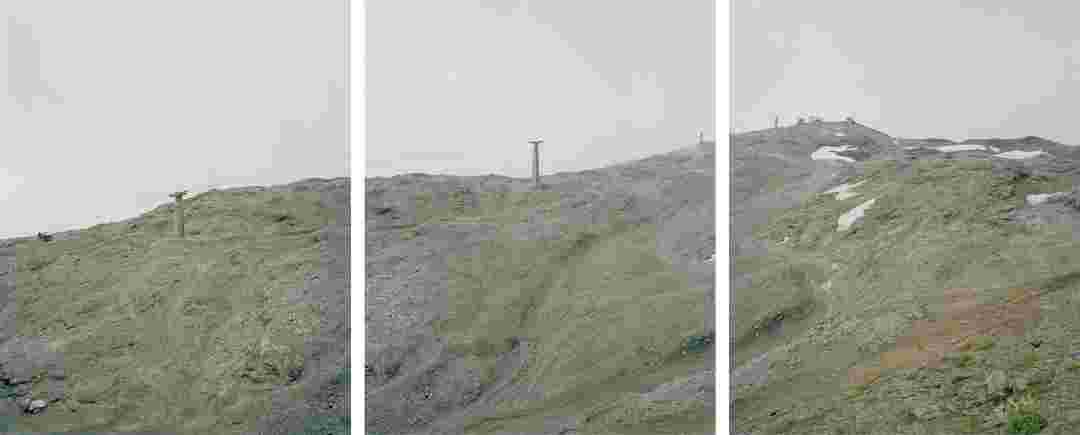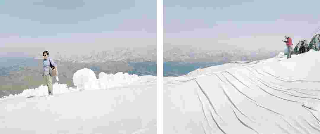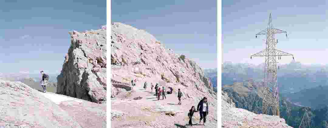 Élements alpins explores the transformation of the Alps under the impact of infrastructure and human flows. The series shows how the once hostile mountains have become a hybrid space of rock and concrete, marked by mass tourism and human activity. The photographs capture crowds engaged in various activities, offering a quasi-anthropological perspective without promoting tourism, but rather suggesting that human occupation of the mountains is an irreversible modification, transforming the Alps into anonymous and interchangeable non-places. Through human constructions and flows, space and movements sometimes recreating a new spatial and temporal dimension. The role of the mountains is also questioned: they have become a place of exoticism and mass tourism, like the many visitors exploring the ice caves in the glaciers before they disappear in a very short time…