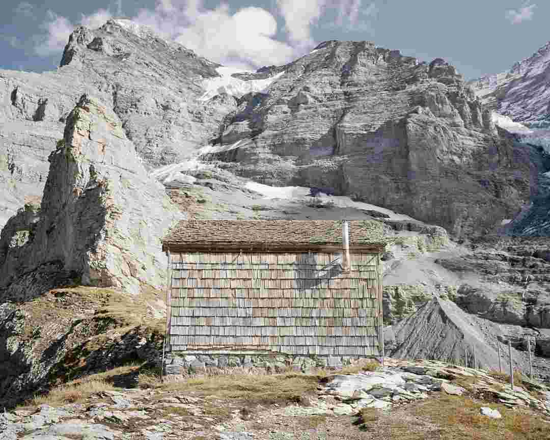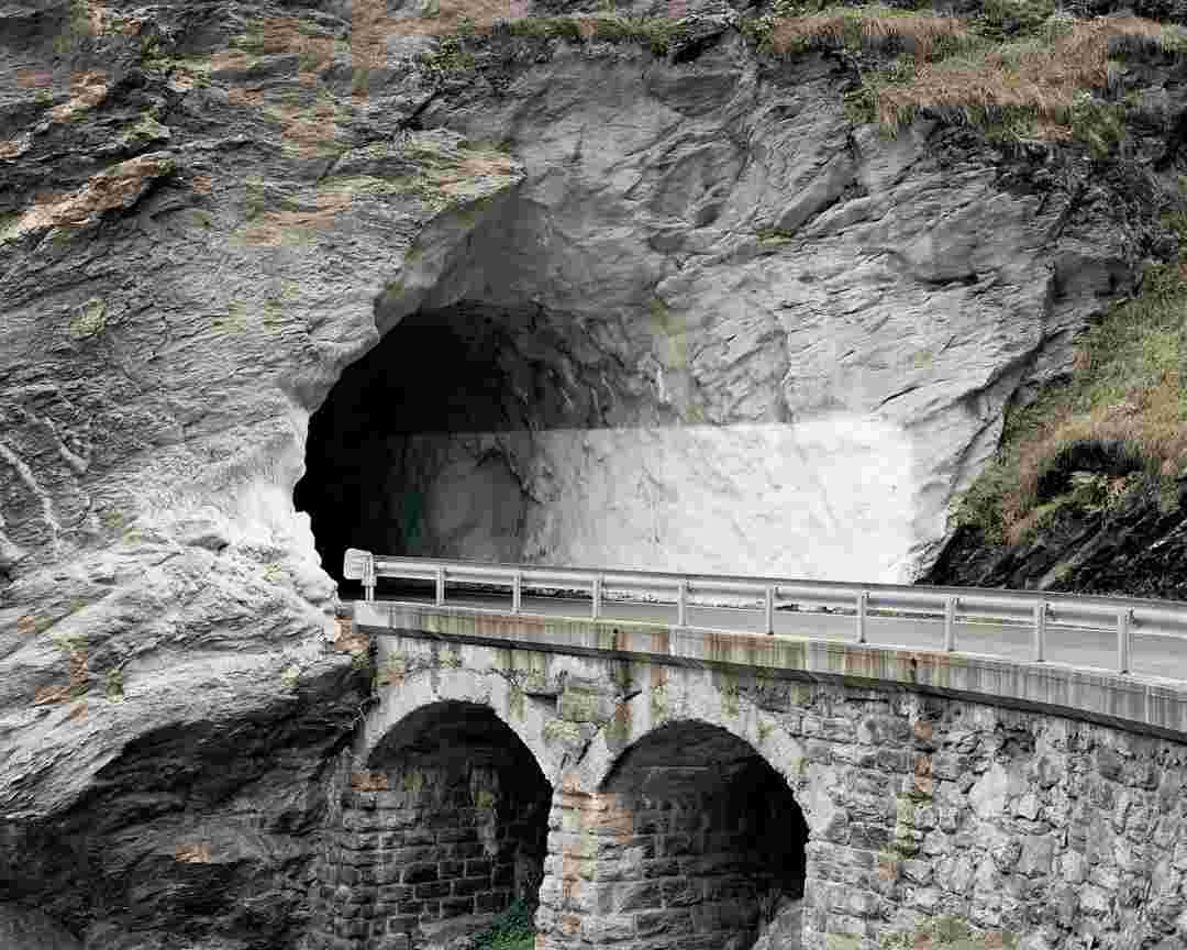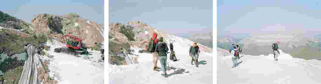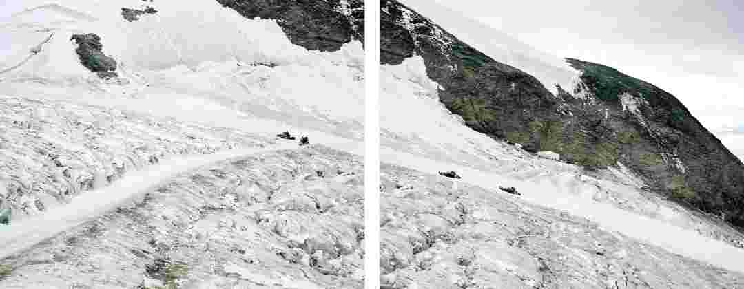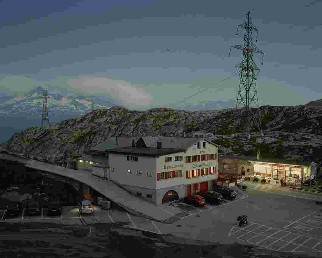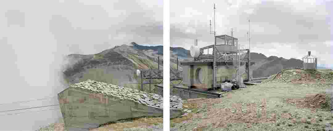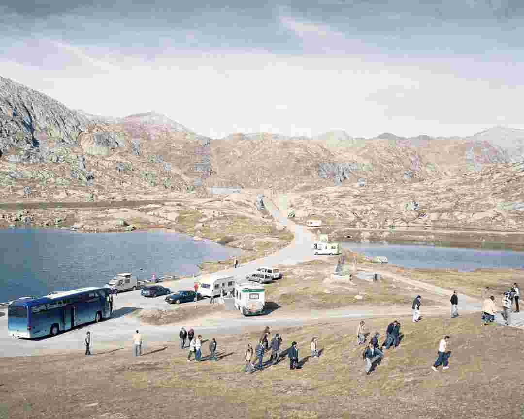 Élements alpins explores the transformation of the Alps under the impact of infrastructure and human flows. The series shows how the once hostile mountains have become a hybrid space of rock and concrete, marked by mass tourism and human activity. The photographs capture crowds engaged in various activities, offering a quasi-anthropological perspective without promoting tourism, but rather suggesting that human occupation of the mountains is an irreversible modification, transforming the Alps into anonymous and interchangeable non-places. Through human constructions and flows, space and movements sometimes recreating a new spatial and temporal dimension. The role of the mountains is also questioned: they have become a place of exoticism and mass tourism, like the many visitors exploring the ice caves in the glaciers before they disappear in a very short time…