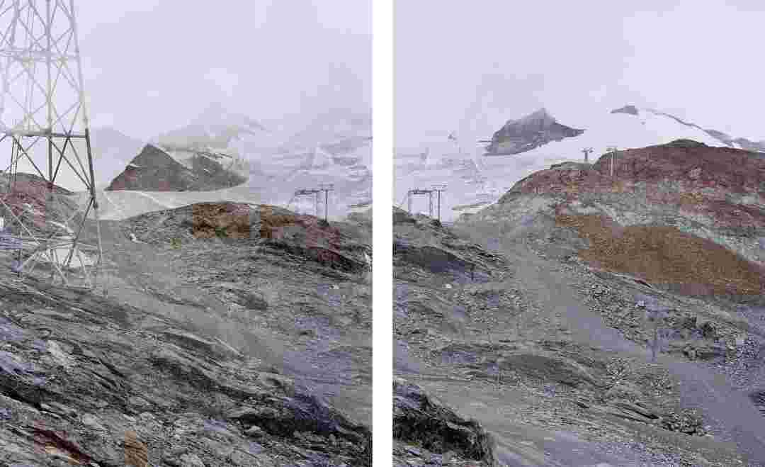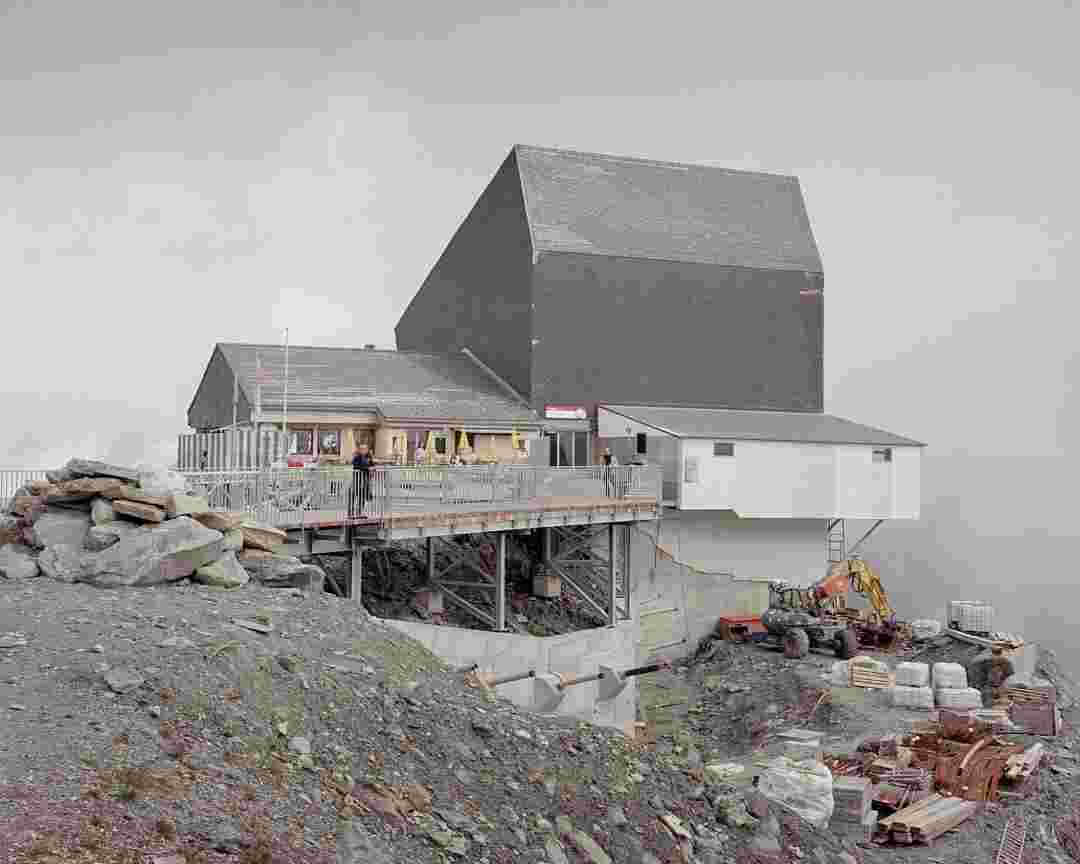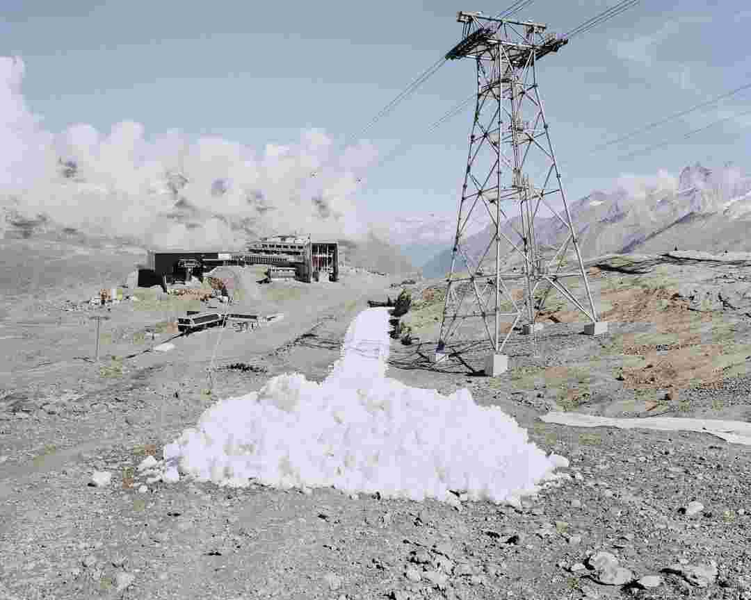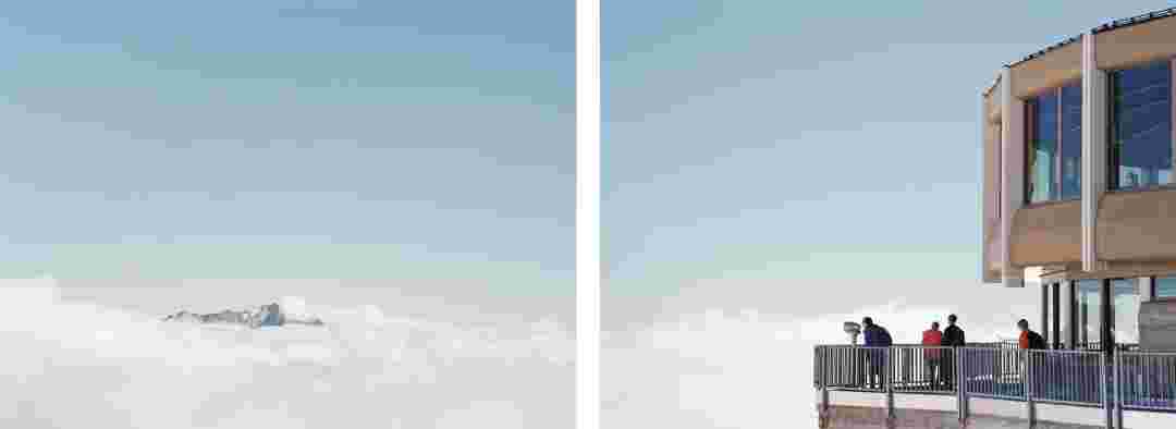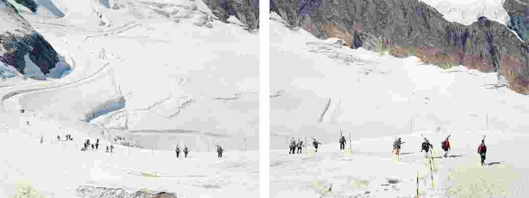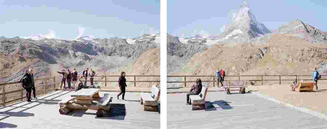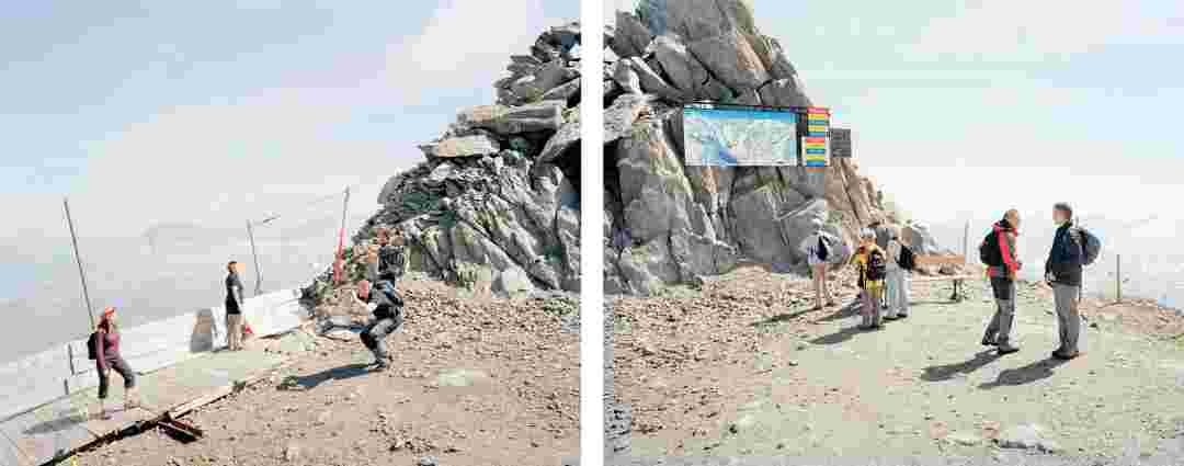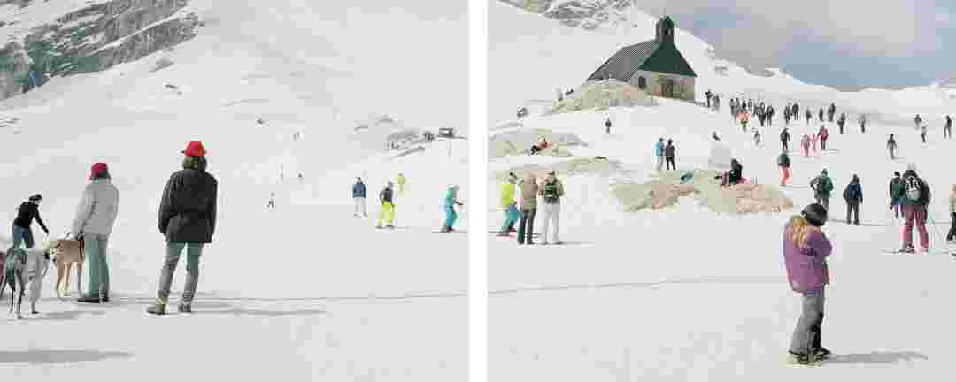Élements alpins explores the transformation of the Alps under the impact of infrastructure and human flows. The series shows how the once hostile mountains have become a hybrid space of rock and concrete, marked by mass tourism and human activity. The photographs capture crowds engaged in various activities, offering a quasi-anthropological perspective without promoting tourism, but rather suggesting that human occupation of the mountains is an irreversible modification, transforming the Alps into anonymous and interchangeable non-places. Through human constructions and flows, space and movements sometimes recreating a new spatial and temporal dimension. The role of the mountains is also questioned: they have become a place of exoticism and mass tourism, like the many visitors exploring the ice caves in the glaciers before they disappear in a very short time…