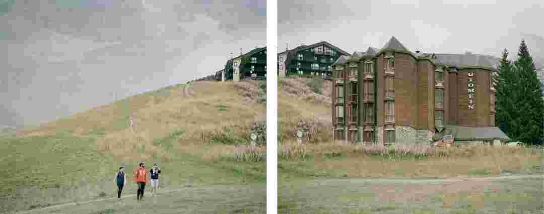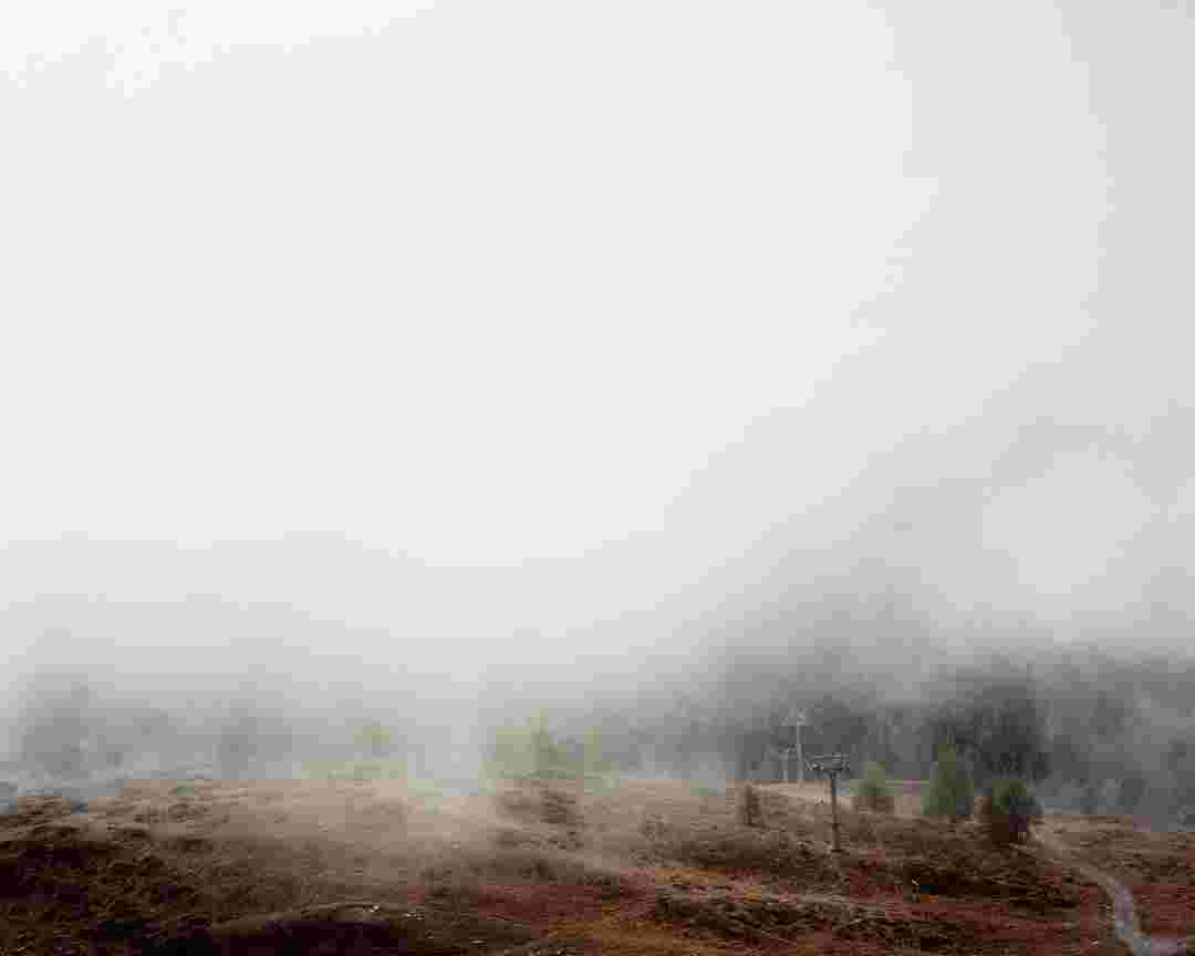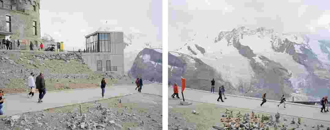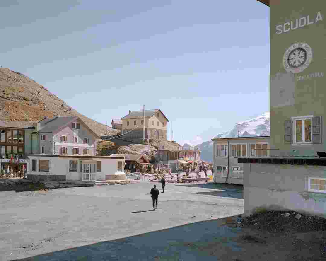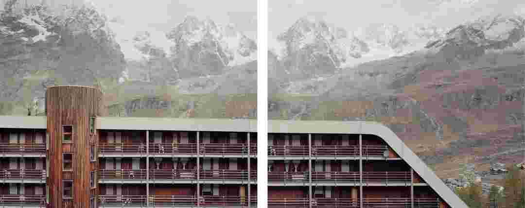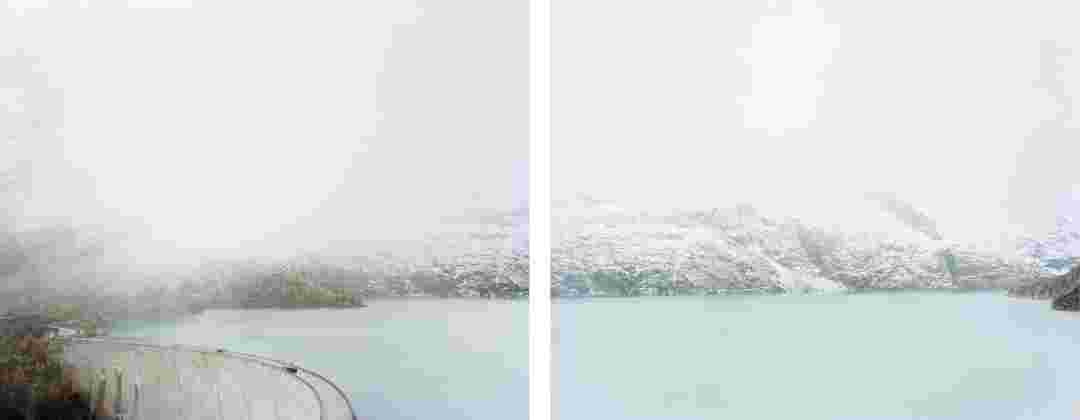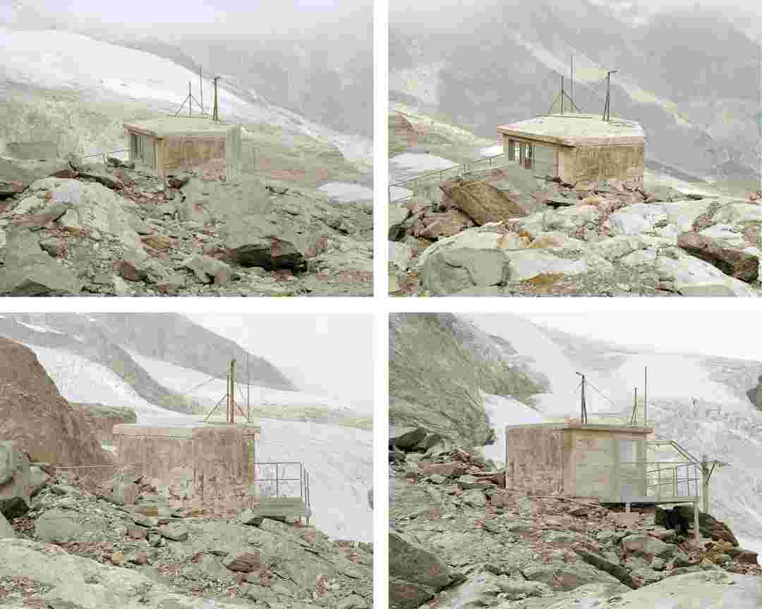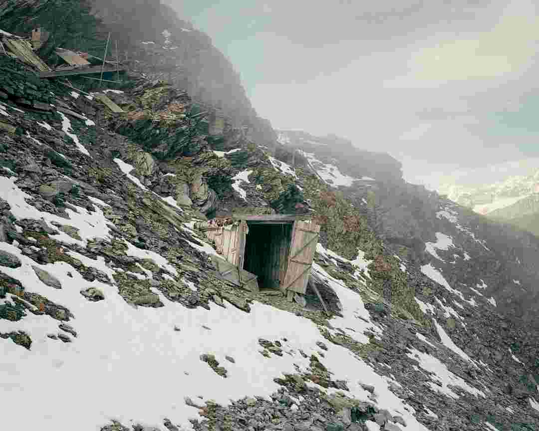 Élements alpins explores the transformation of the Alps under the impact of infrastructure and human flows. The series shows how the once hostile mountains have become a hybrid space of rock and concrete, marked by mass tourism and human activity. The photographs capture crowds engaged in various activities, offering a quasi-anthropological perspective without promoting tourism, but rather suggesting that human occupation of the mountains is an irreversible modification, transforming the Alps into anonymous and interchangeable non-places. Through human constructions and flows, space and movements sometimes recreating a new spatial and temporal dimension. The role of the mountains is also questioned: they have become a place of exoticism and mass tourism, like the many visitors exploring the ice caves in the glaciers before they disappear in a very short time…