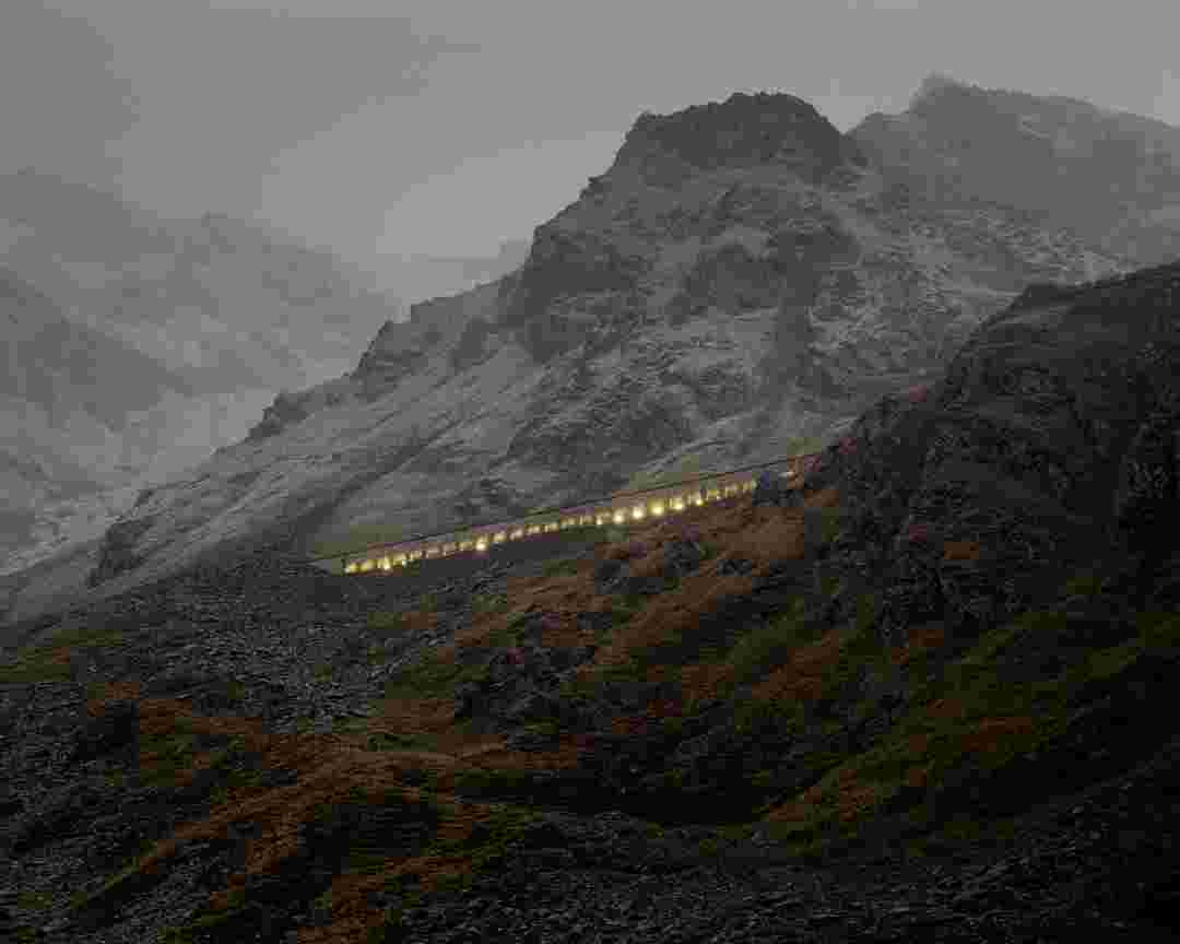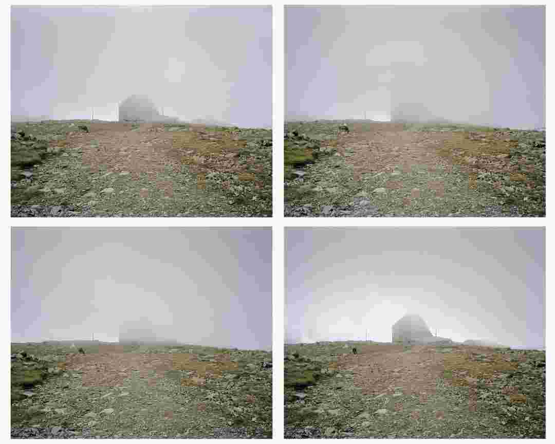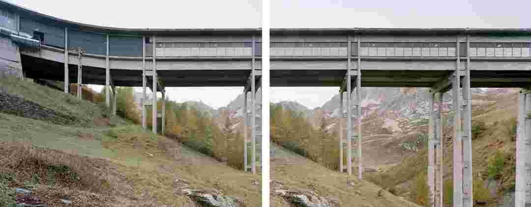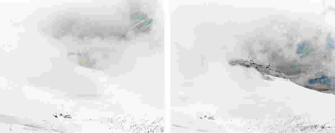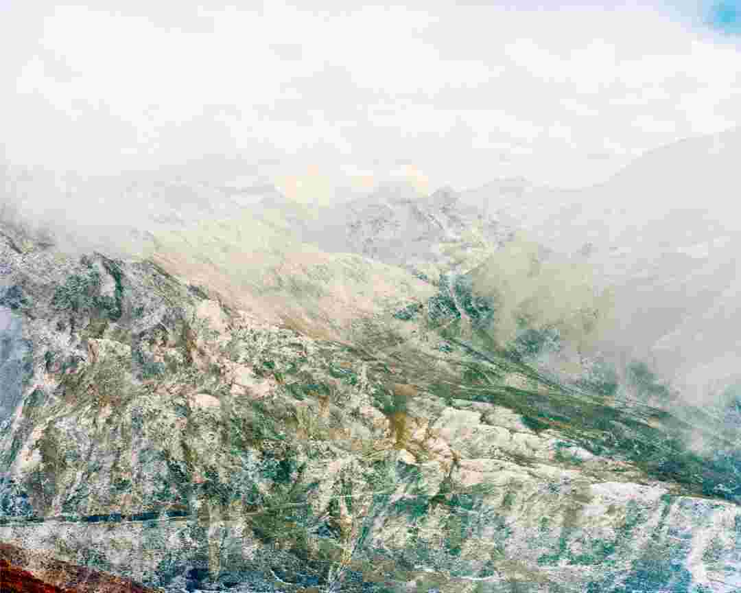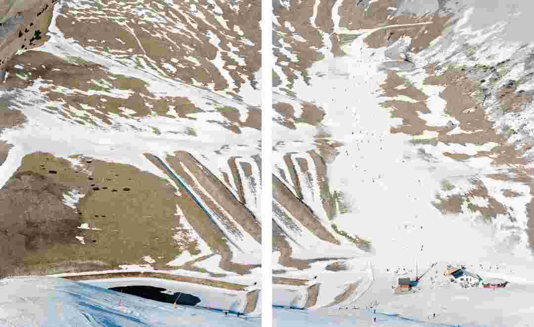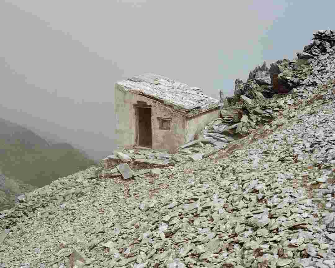 Élements alpins explores the transformation of the Alps under the impact of infrastructure and human flows. The series shows how the once hostile mountains have become a hybrid space of rock and concrete, marked by mass tourism and human activity. The photographs capture crowds engaged in various activities, offering a quasi-anthropological perspective without promoting tourism, but rather suggesting that human occupation of the mountains is an irreversible modification, transforming the Alps into anonymous and interchangeable non-places. Through human constructions and flows, space and movements sometimes recreating a new spatial and temporal dimension. The role of the mountains is also questioned: they have become a place of exoticism and mass tourism, like the many visitors exploring the ice caves in the glaciers before they disappear in a very short time…